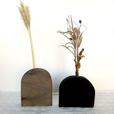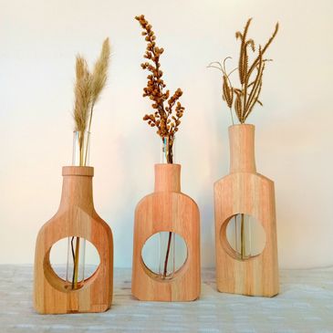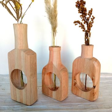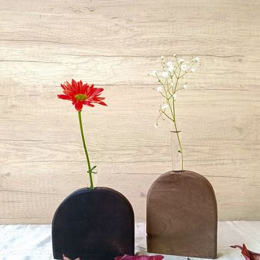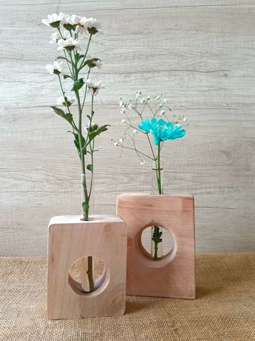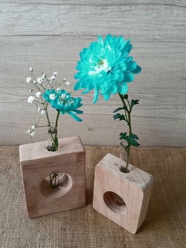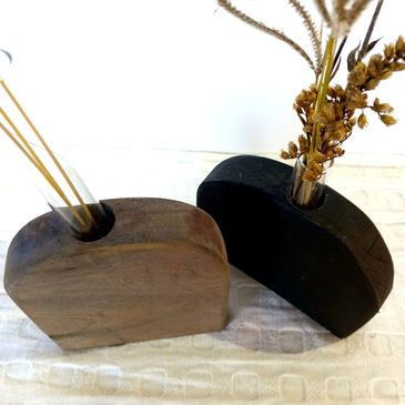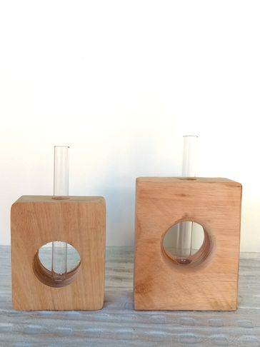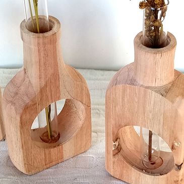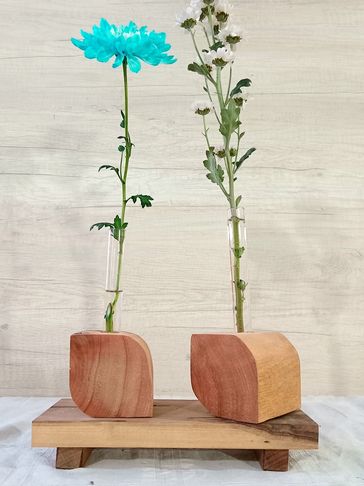 Dúo de floeritos artesanales en madera teñida, la tonalidad puede variar de un producto a otro. incluye tubo de ensayo de de 10 y 15 cms de altura