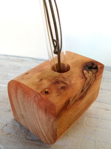 Realizado artesanalmente en madera con tubo de ensayo de 15 cms de altura. las medidas varían según diseño. Tubo incluído en el precio.-